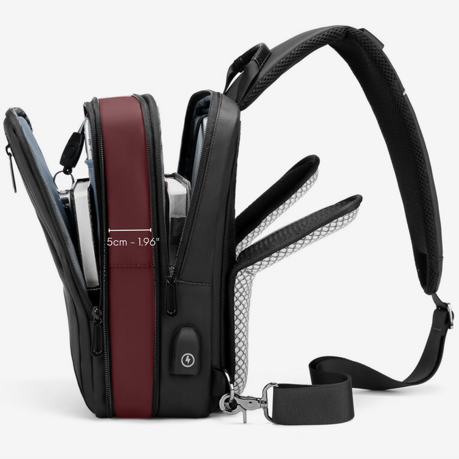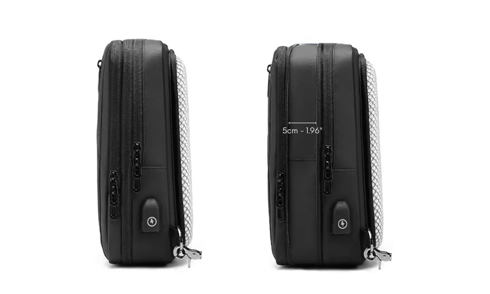 No more dead batteries thanks to its built-in USB port and its compartment specifically designed for your external battery (device not included).