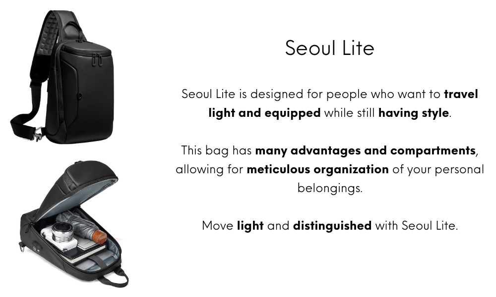 Stylish, sturdy, and smart, the Seoul Lite shoulder bag has been specially designed to meet the demands of active people.